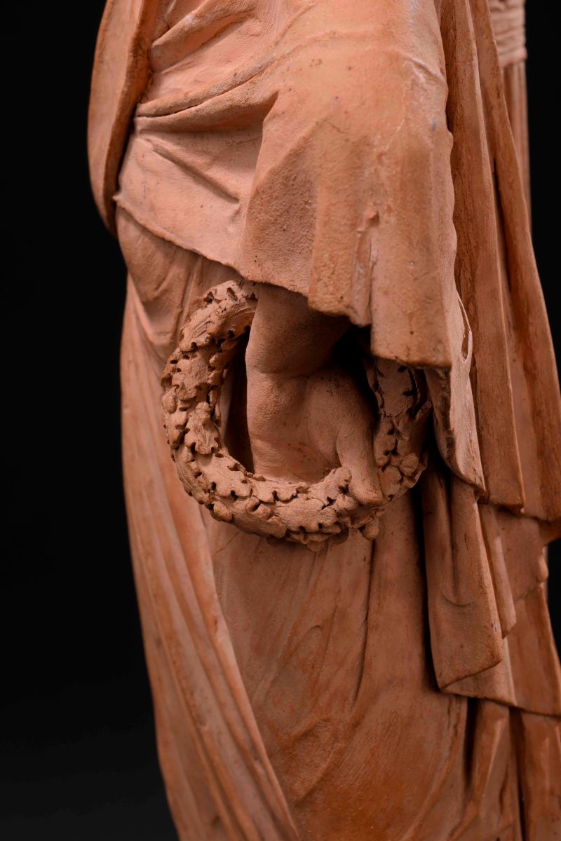 Présence d’une étiquette lacunaire à l’intérieur : 78. Statuette de … / par Chinard. Elle représen…/ un faisceau de licteur, la main droite reposant sur les tables des lois républicaines. Terre cuite. H.47 cm/ Exposition de l’œuvre de Chinard, /aux Arts décoratifs, 1909, n°1.)
