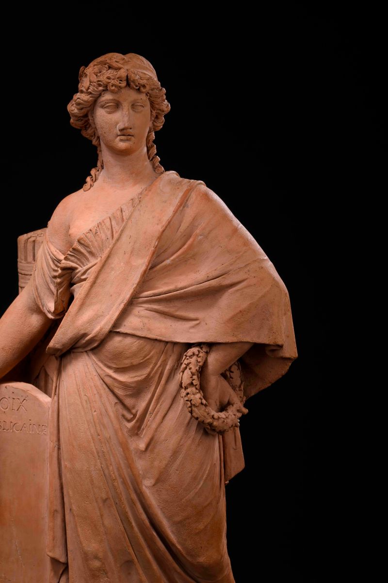 -Joseph Chinard, La République, 1794, statuette en terre cuite, dim. 35 x 27,7 x 16,4 cm, signé sur la plinthe à droite « Chinard inv. Et fe(cit) 23 jerminal (sic) l’an 2m de la R.f.u et ind. » (pour 12 avril 1794), Paris, musée du Louvre, n°inv. RF1883.