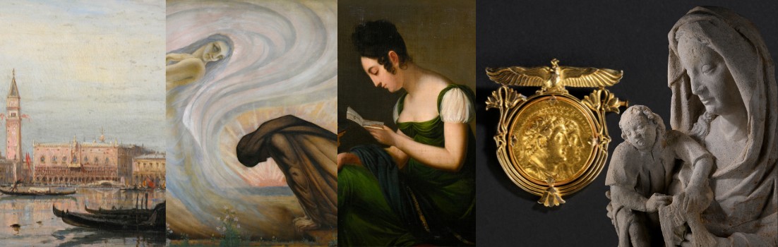 Quatre collections seront à l’honneur : une sélection haute-époque provenant du Château de Panneville; l’ancienne collection d’art russe de Ury de Gunzburg avec deux oeuvres de Alexeï Petrovitch Bogolioubov (dont une Vue de Venise, estimation 30 000 / 50 000 €), une collection privée liégeoise (tableaux anciens, art russe, orfèvrerie et mobilier belge XVIIe et XVIIIe) et une collection privée lorraine de tableaux romantiques et du XVIIIe dont une huile sur toile signée par Louise Marie Jeanne Mauduit (1784-1862), future madame Louise Hersent (estimation 5 000 / 8 000 €).